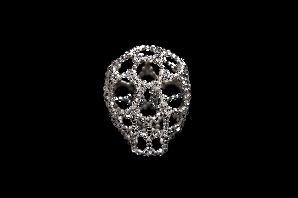 この作品はクリエイティブディレクターのFUJI TATE Pが敬愛するデザイナー、アレキサンダー・マックイーンへのオマージュ作品です。ビーズをテグスで編み込んで立体を構築する技法で作りました。現在も発表を続けているファッションブランド “Alexander McQUEEN” とは関係ありません。(2014年2月11日発表)